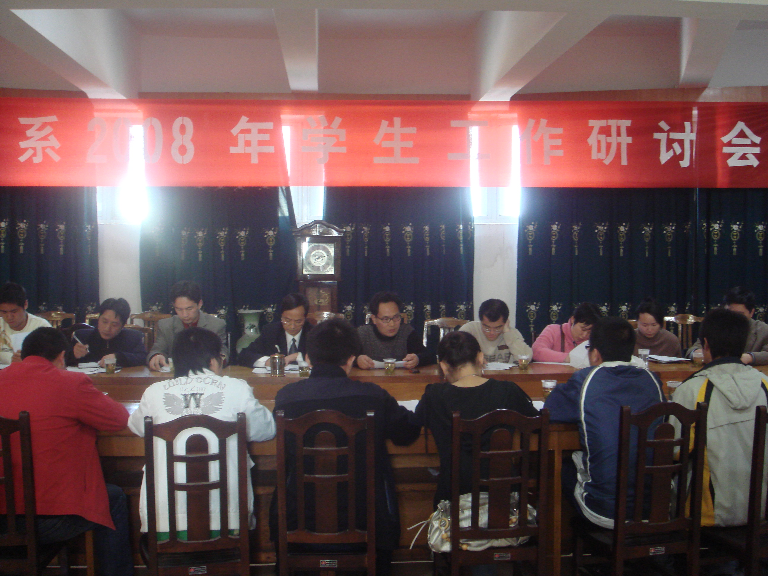 首先,系主任罗李平教授以“探索学生思想新思路,营造文明和谐的育人环境”为主题,从高校学生心身理特征、人才培养的目标和健全完善高校学生管理制度等三个方面,强调了学生管理工作的重要性。接着,系党总支书周炎林详细列举了学生工作中存在的各种问题,并对2008年的学生工作提出了新的要求。然后,优秀班主任代表周勇老师进行了发言,他不仅总结了在学生工作中的个人经验,而且提出了以学习为中心,加强思想品德教育的育人思想。系副主任杨柳则提出了要有忧患意识,狠抓学风建设,锻炼学生各项能力的工作目标。最后,林书记作了会议的全面总结。