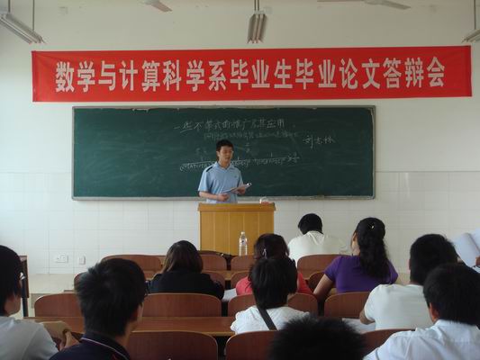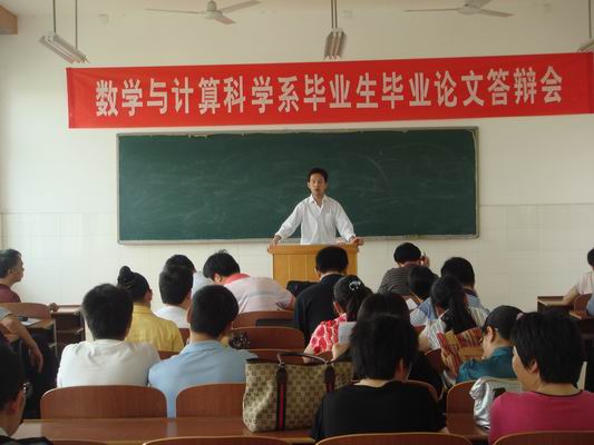 5 月10日上午,数学与计算科学系2009届毕业生毕业论文答辩会在数学教学楼421室举行。系党总支书记周炎林、系主任罗李平教授、系副书记林琼、系副主任杨柳以及数学与计算科学系全体专任教师与2009届毕业生参加了此次答辩会,答辩会由数学与计算科学系副主任杨柳主持。