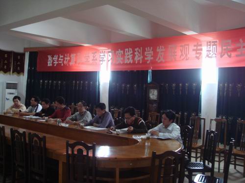 5月26日下午2:30,按照院学习实践活动领导小组的部署,数学与计算科学系党总支召开学习实践科学发展观专题民主生活会。数学与计算科学系领导班子成员周炎林、罗李平、林琼、杨柳等参加会议,并邀请民主党派代表毛旭华,教研室主任高正晖、周勇、阳志锋和实验室主任彭白玉,行政人员代表肖炜列席。院党委组织部副部长赵文斌同志到会指导。 会上,数学与计算科学系党总支书记周炎林同志首先介绍了前一段调研情况和召开民主生活会的前期准备工作。在专题民主生活会之前,数学与计算科学系做了大量的前期准备工作,围绕学习实践活动中要解决的八个突出问题,通过发放调查问卷、召开座谈会、个别访谈等各种形式进行调研,广泛征求了各方面的意见。共发放调查问卷104份,召开座谈会4次,征求意见和建议34条。班子成员之间开展了谈心活动,认真撰写了分析检查报告,初步形成了一批有价值、有份量,具有较强理论性和操作性,对我系科学发展具有指导性的调研成果。 专题民主生活会上,数学与计算科学系班子成员根据师生员工提出的意见和建议,认真查找个人和班子成员在贯彻落实科学发展观方面存在的突出问题,查找个人在党性党风党纪方面存在的问题,并深刻剖析其主观原因,开展批评和自我批评。大家坦诚相对、畅所欲言,整个专题民主生活会气氛非常和谐,且本次民主生活会切实达到了统一思想、促进工作、增进团结和推进科学的目的。
