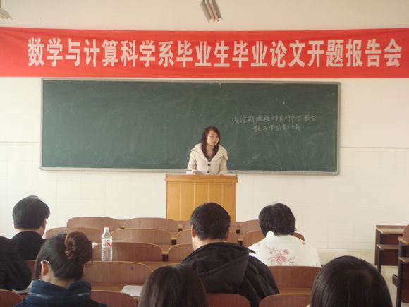 3 月13日上午,数学与计算科学系2006级毕业生毕业论文开题报告会在数学教学楼420室举行。系党总支书记周炎林、系主任罗李平教授、总支副书记林琼以及数学与计算科学系全体专任教师与毕业生参加了报告会。报告会由数学与计算科学系副主任杨柳主持。
