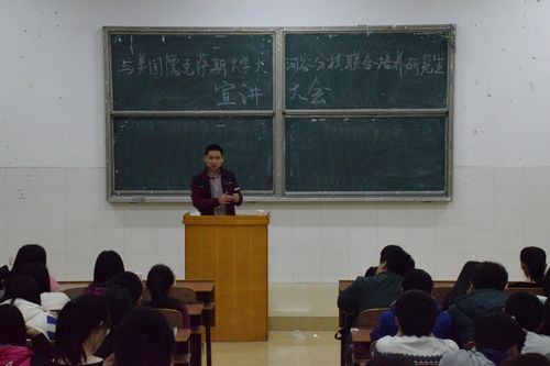 罗李平院长首先介绍了召开本次大会的目的,勉励大家在学好专业课程的同时,加强英语训练、提高英语应用能力。接着,李龙副院长详细地向学生们介绍了与UTRGV联合培养研究生项目的具体事宜,该项目为3.5+1.5的培养模式,即学生在我校就读3年半,然后到UTRGV读1年半,毕业后可以拿到我校本科文凭和UTRGV硕士文凭。同时,李龙副院长也强调了被推荐的学生一定要具备的条件:第一,托福成绩要达到对方学校的要求,即550分(paper-based)或者213分(computer-based)或者79分(internet-based);第二,专业成绩要求在班上前5%,且不能有补考科目;第三,家里要有一定的经济基础,学生需支付在美学习期间的学费和生活费。会议最后互动环节由同学们提出了相应的问题,李龙副院长耐心一一回答,整个宣讲会在轻松的氛围下进行。 怀着对异国风土的好奇和对研究生的向往,参会的同学们表现出了强烈的热情。通过本次宣讲会,同学们不仅对国外大学学习模式有了进一步了解,更激励着学子们考研的决心。