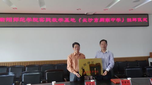 在授牌仪式上,长沙市周南中学校长翁光龙对我校副校长张登玉一行莅临长沙周南中学举行实践教学基地挂牌暨客座教授聘任仪式表示热烈欢迎,并通过电视短片介绍了周南中学的发展历史、师资队伍建设、办学特色和人才培养等。我校副校长张登玉简要介绍了我校的办学历史及在师范生培养过程中采取的顶岗实习、组建卓越教师班、试行粉笔字人人过关考核、建设省级教师教育虚拟仿真教学中心等一系列措施,以营造师范生培养的良好氛围,进一步彰显师范特色。同时,他指出,两校合作的内容不仅仅是简单的教育实习,可以从联合培养教师、教师交流互派、课程资源联合开发、教研科研合作、成果联合申报等领域不断推进,深化高层次的务实合作,实现双方共赢。 授牌仪式后,我校副校长张登玉将客座教授聘书颁给长沙市周南中学数学特级教师雷丹老师。