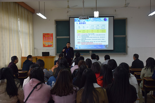 招聘会于上午9点30分在数学楼217教室正式举行。首先,富士康集团衡阳工业园人力资源部彭志龙课长作了简短的宣讲会。他从富士康集团简介,集团布局、主要客户、人文环境、和谐社会、领导期许以及FIH(富智康集团)和WLBG事业群简介、布局、岗位需求、薪酬福利等方面全方位地向毕业生进行了介绍,也让毕业生全面了解了富士康集团的自然和人文环境。