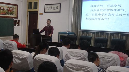 5月24日下午,船山实验中学肖高君校长一行5人莅临402永利集团参加以“校校合作,共筑卓越”为主题的卓越教师指导经验交流会。会议在数学楼三楼会议室召开,教务处罗文处长、402永利集团领导,14级数学与应用数学专业卓越班指导老师和全体学员参加了本次会议。