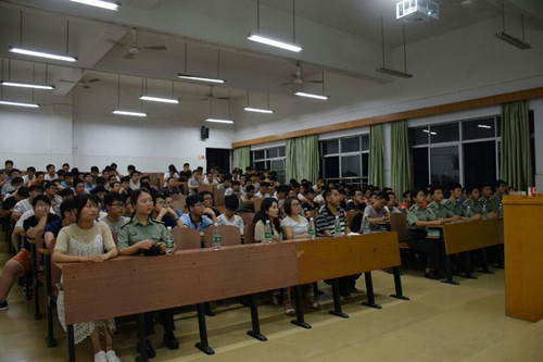 大会在一段极富激情与热血的视频——《中国力量》中拉开了序幕。首先,韩老师以我校优秀大学生为例,从他们良好的表现中告诫我们每一个人,退役大学生之所以如此优异,是因为他们在部队里经历了重重困难的考验,纠正了不良行为,养成了良好习惯。随后,五名优秀退役大学生分别进行了自身经历的述说。音乐学院的江帆从个人经历入手,为大家解说了关于兵种、报名征兵的各项程序,法学院的帅吉满怀深情地说道,当兵的生活很充实,部队不仅成就了他的毅力也成就今天的自己;另一位来自法学院的谭圣广则用着较为幽默的语言阐述了当兵后的改变,“当兵是每一个男孩心中的军人梦,部队的生活有苦但更多的是快乐和有意义,正是因为当兵时的锻炼激励我不仅考上了研究生更获得留校的机会,是部队的历练,让我收获了这些成就”。