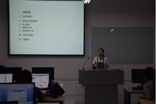 依据本学期开设的《数据分析与处理实训》实践教学,此次成果展示和汇报分为13个小组。同学们从不同方向进行选题,涵盖了当代大学生对于考研的看法、“全面二胎” 政策背景下子女性别对父母幸福感影响的调查、基于SEM的城市公交服务质量满意度研究、快递客户满意度调查等多个方向,设计调查问卷,进行数据收集、分析和调查报告的撰写。首先,由各小组代表依次上台进行成果展示和汇报,汇报内容主要围绕选题背景、研究方法、结果分析、结论和建议等几个方面,全面展示了各组的研究成果。随后,指导老师就各组成果汇报情况进行提问和点评。最后,黄海午老师对本次活动进行总结,他表示2015级统计学专业全体同学应当以此次活动为契机,锻炼自己,努力学习,进一步提升自身的专业技能水平和综合素质,并对各小组汇报过程中存在的问题提出了几点建设性意见:一是在表述过程中要注意语言精炼,重点内容突出;二是要注意PPT的整体美观性和整洁性,内容要压缩,格式要规范;三是在成果汇报中尽可能使用图表,能用图表说明的问题则不采用文字;四是在数据处理和方法应用上要讲究其准确性与科学性。各小组成员纷纷表示,之后会结合指导老师的意见和建议,进一步完善研究成果,争取取得新的进步。
