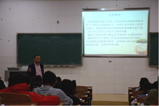 讲座中,周老师围绕“90项症状清单自评量表即scl-90症状自评量表”各测评项进行了生动形象的讲解,让同学们对自己目前的心理状况有了一个初步的了解。同时,周老师指出心理测评只能反映出近期的心理状况,其结果也只是代表一种“可能性”,不要给自己太大的思想包袱,也不要给自己对号入座,不随便给自己贴标签,但若有什么问题,也要及时进行心理咨询。其后,他就大学生活中常见的困扰:自我困扰、学习困扰、人际关系困扰、生活困扰、职业发展目标困扰、情感困扰等向同学们提出了自己切实可行的建议和解决方案,指出了同学们对于心理咨询所存在的误区。他强调,适应是一种放弃,是一种接受,是一种改,更是一种挑战。如果适应不良,就可能会出现种种心理困惑,要改变我们能改变的,适应我们不能改变的。此外,他希望同学们大学四年要学会欣赏别人,也要学会欣赏自己,定下目标,做好规划,并表示如果对于未来规划有迷茫,可以选择向大学生就业指导老师求助。