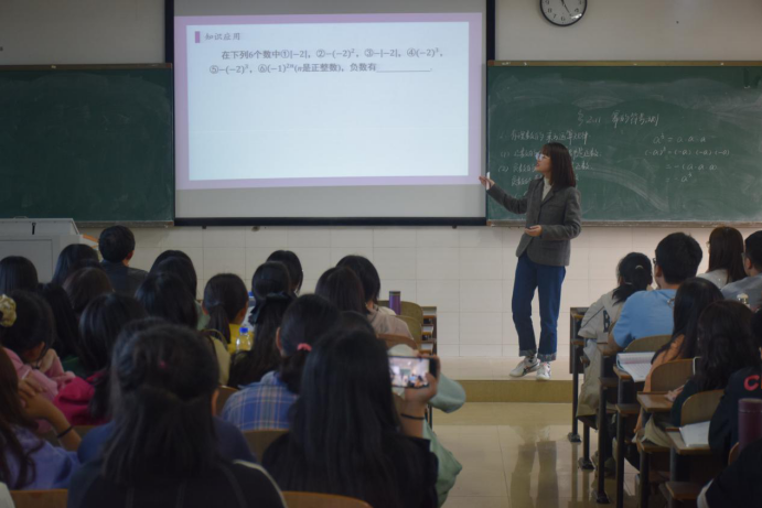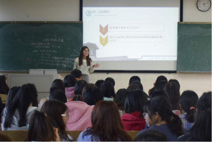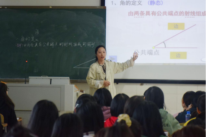 紧接着,易佳慧、凌翠阳、张妍三位老师依次上台向同学们展示了三场各具风格的片段教学。易佳慧老师通过“旧知”巧妙引入,层层设问、逐步深入,清晰、通透地讲解了“乘方的运算规律”这一知识点。凌翠阳老师带领大家走进数学王国,她以趣味对话的方式导入“三角形的内角和”这一课题,并熟练地运用了数学软件辅助教学进行了严谨的证明。张妍老师在组织同学们开展小游戏的过程中将数学知识与实际生活相融合,探究关于“角”的奥秘。三场教学语言生动、板书工整、引人入胜。