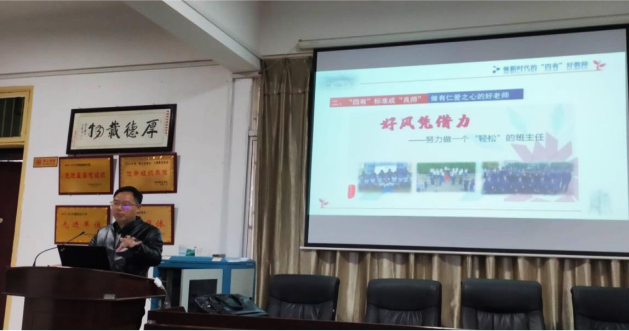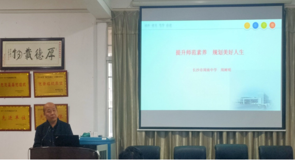 首先,长沙市周南中学校长翁光龙以《做新时代的“四有”好教师》为主题,从“教”字本源出发进行分析,由古人对“教”的解说延伸到当今新时代教育的发展现状与 “智慧教育”,深入阐述了新时代教师应发挥的“举旗帜、聚民心、育新人、新文化、展形象”作用,围绕新时代教师“是什么”以及“怎么做”,强调教师要切实落实“有理想信念、有道德情操、有扎实学识、有仁爱之心”,做学生锤炼品格、学习知识、创新思维、奉献祖国的“引路人”。
