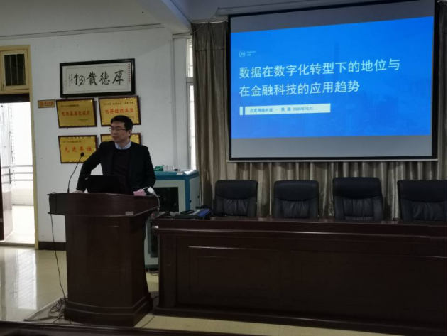 2020年12月9日上午10: 30—12: 00,深圳点宽网络科技有限公司执行董事黄嵩和总经理徐辣应邀来402永利集团讲学与指导,在数学楼学术报告厅作了题为“数据在数字化转型下的地位与在金融科技的应用趋势”专题报告,2018级统计学专业全体学生和学院部分教师共同参加并聆听了此次报告。