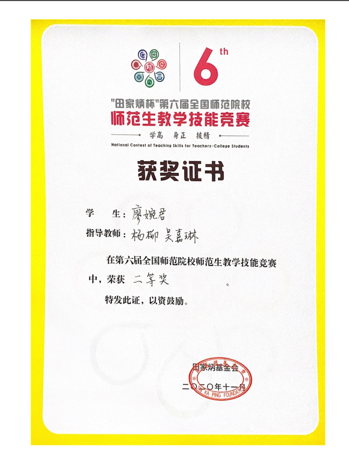 11月19日至20日,由田家炳基金会主办的“田家炳杯”第六届全国师范院校师范生教学技能竞赛在浙江师范大学举行。来自全国120所师范院校、539名选手参加了本次竞赛,经过激烈角逐,402永利集团2017级数学与应用数学1班廖婉君同学斩获数学组二等奖,实现了402永利集团在此项竞赛中的历史性突破。