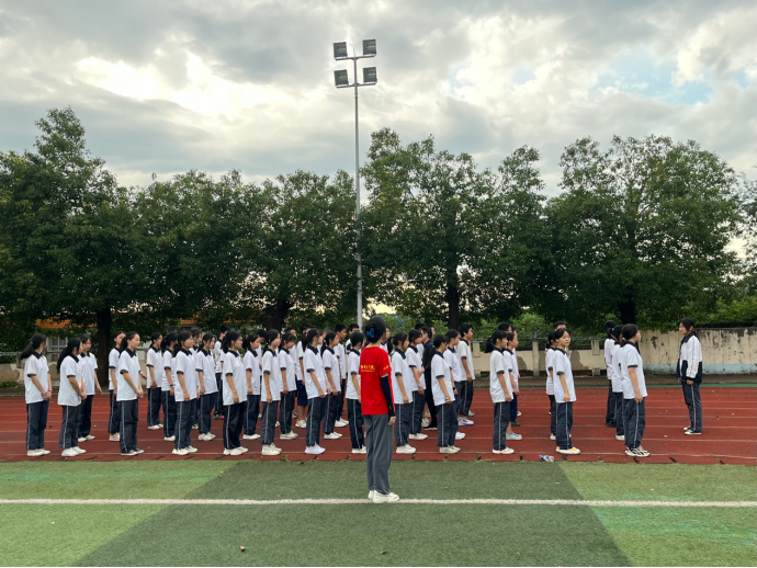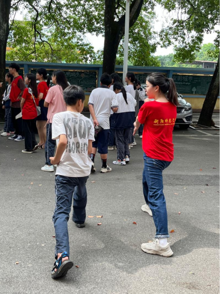 (志愿者李嘉伟带领296班部分学生来到操场,组织学生排队,向学生介绍本节课具体安排)