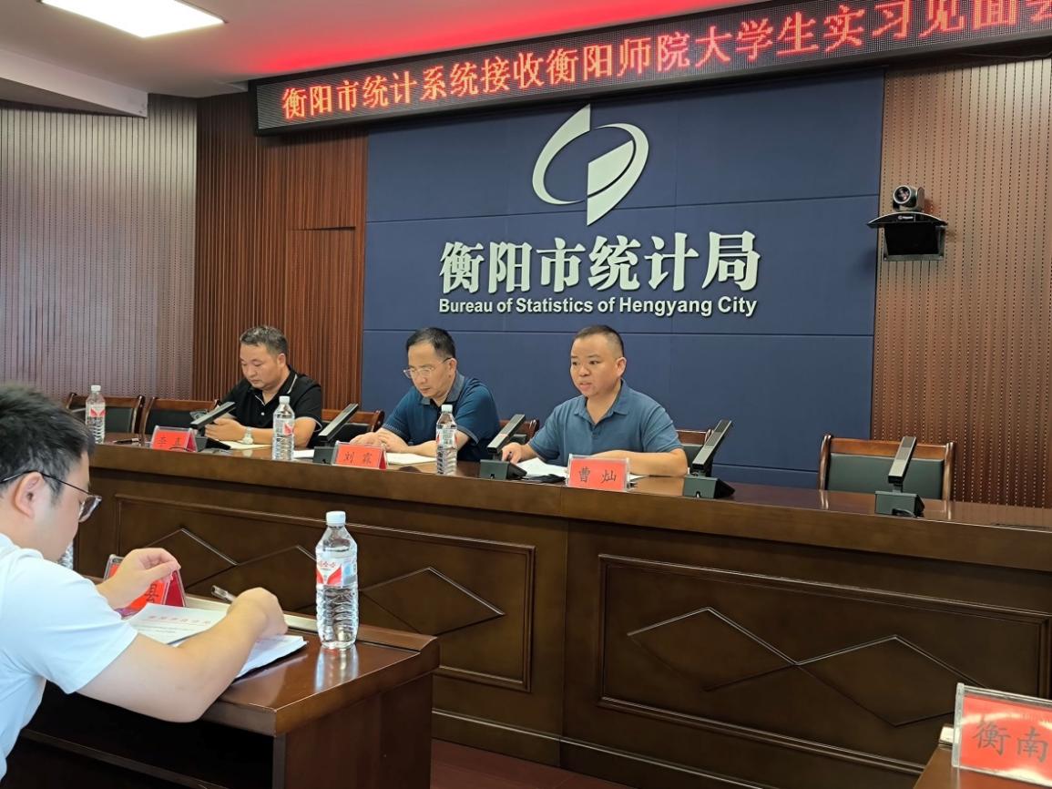 2024年9月13日上午,402永利集团2021级统计学专业实习见面会在衡阳市统计局召开。衡阳市统计局党组成员、副局长刘霖,人事科科长李喜、衡阳市所辖各县市区统计局分管人事副局长和402永利集团统计学专业负责人曹灿博士参加本次会议,会议由衡阳市统计局人事科科长李喜主持。