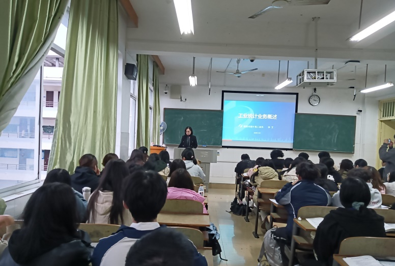 首先,曹灿老师对李芝科长进行了介绍。李芝科长2010年硕士研究生毕业后进入衡阳市统计局工作。目前已有十四年统计实务工作经验。接下来,李芝科长分别从工业统计基本知识、工业统计报表填报、工业统计数据分析和工业统计工作努力的方向四个方面对工业统计实务进行深入讲解。工业统计的基本知识主要包括:工业统计的主要任务、调查范围、调查对象、调查构成、调查内容、主要指标和数据生产流程等几个内容。李科长结合统计工作实际情况,深入浅出的介绍工业统计的各个方面。在讲座的过程中,李科长讲了在工业统计过程中进行实地调查中发生的一些故事,通过实际案例给大家讲解统计实务的相关内容。本次讲座生动具体,围绕统计系统中工业统计的实际工作内容展开,让大家深入了解工业统计中需要处理的重点问题。现行工业统计主要由规模以上工业全面统计和规模以下工业抽样调查。在统计实践中要将全面统计和抽样调查相结合。在实践教学课程中让大家感受到统计理论的广泛应用。再次,李科长对工业统计报表的填报进行深入分析。李科长结合统计工作实践,分别从工业总产值、分行业小类产值、主要工业产品产量、工业销售产值、出口交货值和工业增加值等方面对工业统计报表进行深入讲解。同时李科长鼓励大家认真学习财务知识和统计知识,为今后从事统计工作打好基础。最后,李科长对本次讲座进行了总结。工业统计今后努力的方向是科学研判、忠诚履职和夯实基础。