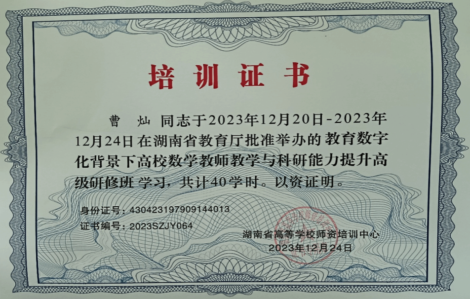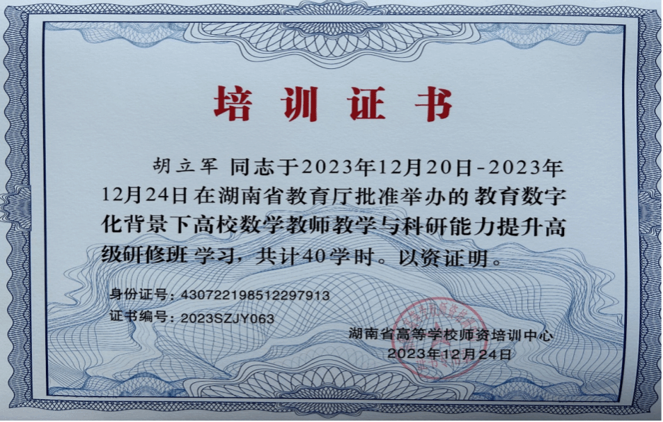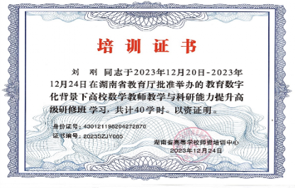 2023年12月20日至24日,由湖南省高等学校师资培训中心主办,湖南师范大学402永利集团承办的2023年教育数字化背景下高校数学教师教学科研能力提升高级研修班在湖南师范大学顺利开办。402永利集团胡立军博士,刘刚博士和曹灿博士作为我校教师代表参加了此次研修活动。