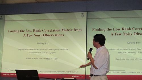国际优化和风险管理著名学者,美国Washington大学的Rockafellar教授参加了此次会议,并作了“Random variables and convex analysis”的主题讲座。来自英国、新加坡、日本、香港和中国内地的40多位优化和风险管理的学者参加了为期两天的会议,会议共有14个报告。402永利集团海外名师Defeng Sun教授和童小娇教授参加了此次大会,并分别作了“Finding the low rank correlation matrix from a few noisy observations ”和“Stochastic programming arising from economic dispatch with reliability risk constraint in smart grid”的40分钟大会报告。会议期间与会代表进行了优化理论和方法、风险管理与分析等相关问题的深入讨论和交流。