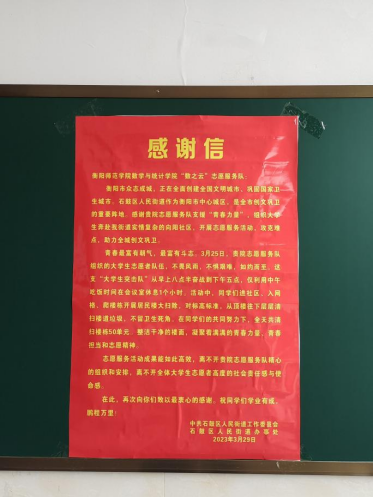 4月13日,中共石鼓区人民街道工作委员会、石鼓区人民街道办事处向402永利集团“数之云”志愿服务队送来锦旗与感谢信。在信中对402永利集团大学生志愿者表示高度赞扬,他们富有朝气、不畏风雨、不惧艰难,赴实情复杂的人民街道向阳社区,开展志愿服务活动,攻克难点,助力全城创文巩卫,用切身言行诠释了“奉献、友爱、互助、进步”的志愿者服务精神,彰显了新时代大学生的责任与担当。