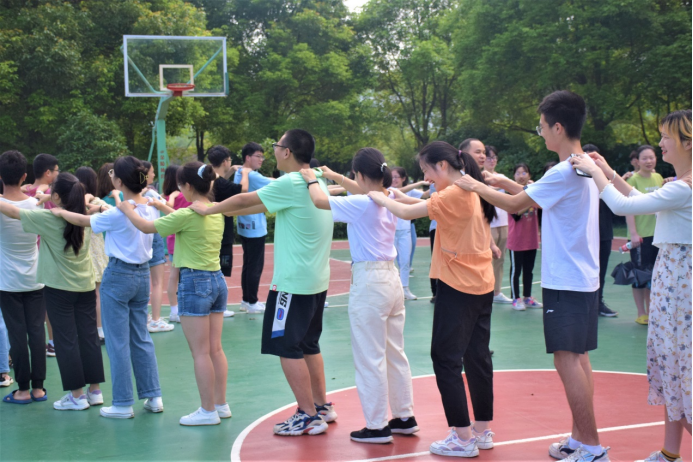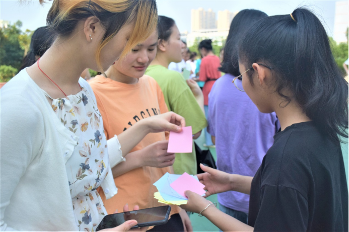 篮球场上,周老师首先为大家讲解了本次活动的注意事项,在大家的欢呼声中,周老师以“我是潜力股”游戏拉开了本次活动的序幕。同学们在发现自己鼓掌的次数远大于估算的数字后,信心倍增,大家逐渐进入状态。随后开展的萝卜蹲、解手结游戏更是让气氛迅速升温,大家团结一致,齐心协力,在解开手结的那一刻,同学们深深感受到理解与合作的重要性,意识到只有成员之间心无间隙,才能解决问题。最后,同学们将自己的问题写在纸条上放进箱子里,周老师随机抽取进行回答,在一片欢声笑语中,本次“互帮互助,伴你成长”团辅活动落下帷幕。