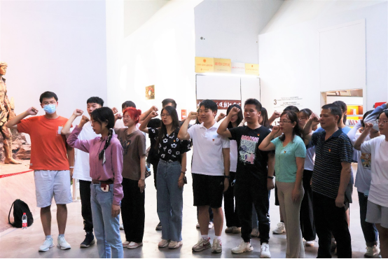 随后,他们带着满腔敬意,在入口浮雕《伟大斗争,光辉典范》下整齐列队, 党支部书记贺妮带领学生党员重温入党誓词,誓言字字铿锵有力,句句掷地有声, 表达了全体学生党员忠诚于党、不忘初心、永葆共产党员本色的炽热情怀,进一步激发了党员同志们不忘初心、牢记使命、永远奋斗的革命精神和革命斗志。