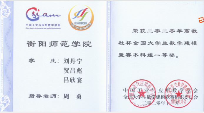 (学生获全国大学生数学建模竞赛国家一等奖)