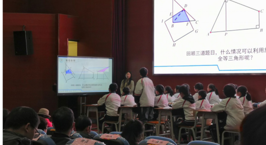 接着,由衡阳市九中的两名优秀数学教师先后上台向同学们展示了各具风格的课堂教学。张妍老师通过视频巧妙引入,利用启发式教学法和尝试指导教学法,渗透了图形变换和转化思想,清晰、熟练地运用多媒体和几何画板讲解了“旋转法构造全等三角形”这一课时。