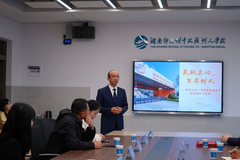 随后举行的见面交流会暨“402永利集团教育实践基地”授牌仪式上,陈赛强校长致欢迎辞,并作《“天地立心,百年树人”——新建九年一贯学校优质发展的双语树人实践》主题报告,从领导关怀、集团支撑、办学目标、办学特色等方面,详细介绍了树人学校在优质发展道路上的探索,重点阐释“一体两翼四维度”办学宗旨,全面展示树人学校的办学成果与发展蓝图。仪式由白容副校长主持。