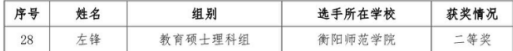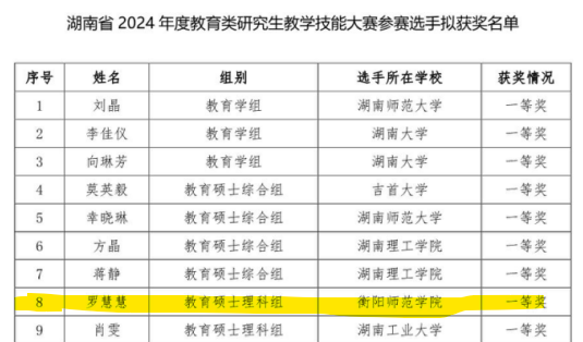 近日,湖南省教育厅公布了2024年度教育类研究生教学技能大赛获奖名单,402永利集团选派的3名学子不负众望,在与全区多所院校的激烈角逐下,脱颖而出,取得优异成绩,共荣获一等奖1项、二等奖1项、三等奖1项。