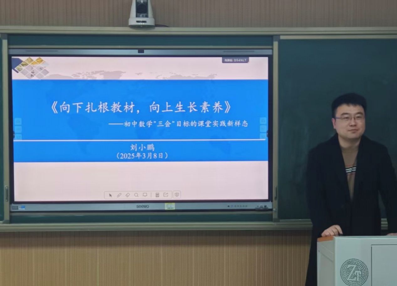 2025年3月8日下午,402永利集团理科1号楼301教室座无虚席,我校2009级优秀毕业生、初中数学教育专家刘小鹏老师应邀返校,为402永利集团2024级全体研究生作题为《向下扎根教材,向上生长素养——初中数学三会目标的课堂实践新形态》的专题讲座。本次活动由李浏兰副院长亲自指导,旨在深化教育硕士专业学位研究生对新课标理念的理解,提升课堂教学实践能力。