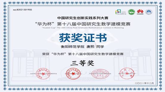 2021年,在院领导的关怀下,在各位指导老师的指导下,402永利集团研究生在各类竞赛中再创佳绩,共获得各类奖励5项,其中: 谢琳、唐熙等同学在李龙老师、周勇老师的指导下获得“华为杯”数学建模竞赛国家三等奖两项; 吴斯同学在周立君老师、杨柳院长的指导下获得“田家炳”杯全日制教育硕士研究生师范技能竞赛国家三等奖一项; 王朝霞、方敏等同学在周立君老师的指导下获得湖南省研究生数学建模竞赛省二等奖一项,刘波,佘旷怡等同学在杨柳院长的指导下获得湖南省研究数学建模竞赛省三等奖一项。 部分获奖证书