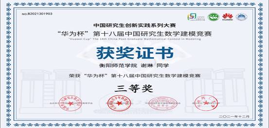 谢琳、唐熙等同学在李龙老师、周勇老师的指导下获得“华为杯”数学建模竞赛国家三等奖两项;