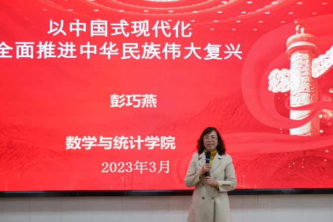 3月22日下午,党总支书记彭巧燕在数学楼306为全体教职工党员上了《以中国式现代化全面推进中华民族伟大复兴》的专题党课,围绕“中国式现代化”从“擘画蓝图、什么是中国式现代化、如何实现中国式现代化”三方面进行了系统讲述,并传达了陈晓飞书记在学校党委会上的指示,号召大家紧扣一条主线,把学习宣传贯彻二十大精神作为首要任务;突出一个中心,加快构建高质量人才自主培养体系;打造一流成果,全面提升学校科研水平和综合实力;扛牢一份责任,以高质量党建引领高质量发展。