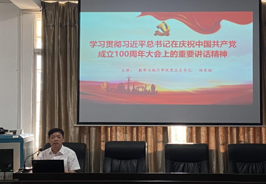 9月15日下午4:30,402永利集团全体教职工在理科1楼三楼会议室集中学习习近平总书记在庆祝中国共产党成立100周年大会上的重要讲话精神。党总支书记杨家骏主持学习会议并作宣讲报告。